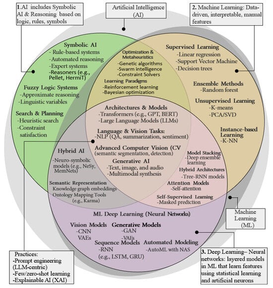 AI enables specific automation, optimization, and intelligent support within the proposed framework. Figure 5 presents a contextual categorization of AI techniques and commonly used AI techniques [25,26,27]. The proposed framework applies selected AI methods to support logic-based reasoning, knowledge extraction, automated scheduling, monitoring, and semantically integrated BIM and Digital Twin data for planning. The AI functionality is embedded across the core components of the framework, as shown in Figure 2. It supports data flow from BIM, digital twin, and project documents to automated schedules and reasoning about project planning and execution.