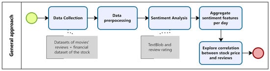 This investigation employs natural language processing (NLP) techniques [,]—as a prominent subfield within the realm of data sciences with several examples of applications—and sentiment analysis [,], which aims to determine the subjectivity and polarity of a provided text, in our case, the movie reviews, using TextBlob version 0.16.0, a Python-based tool that enables the implementation of several natural language processing (NLP) methodologies [,]. The ensuing sections of this paper are structured as follows: Section 2 describes the datasets collected and outlines our approach, which is centered around natural language processing (NLP) and sentiment analysis. Section 3 presents the results of sentiment analysis and the investigation of stock values during the release periods of movies. The discussion subsection covers the examination and analysis of these results, and the research is finalized in the Conclusions section.
