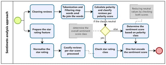 The Rotten Tomatoes and IMDb datasets contain a variable known as the score review, which quantifies the degree of satisfaction conveyed in a movie review. However, it is crucial to acknowledge that the extent of this attribute demonstrates fluctuation within a spectrum encompassing four, five, and ten stars. Furthermore, a scale based on the alphabet is utilized. This particular feature functions as a viable alternative in cases where the polarity score indicates a neutral review. The primary objective of this approach is to reduce the occurrence of neutral class scores, as they offer little understanding of the user’s mood conveyed in the review. In order to standardize the rating score, we employed a normalization process. Specifically, if the value of the star score is less than 0.5, the corresponding review is categorized as negative. Conversely, if the value exceeds 0.5, the review is classed as positive. Reviews are considered neutral if the score star value is either 0.5 or if it is not provided. The methodology for calculating the sentiment score is illustrated in Figure 2.