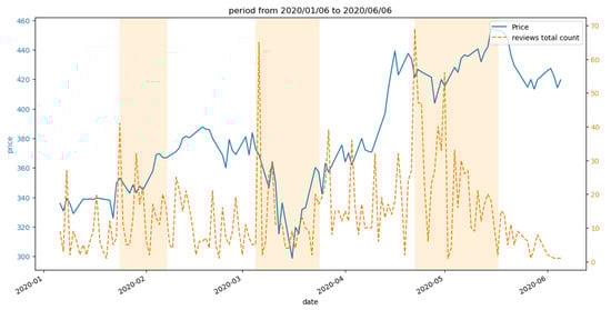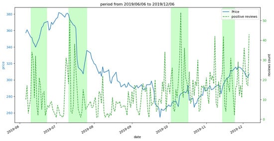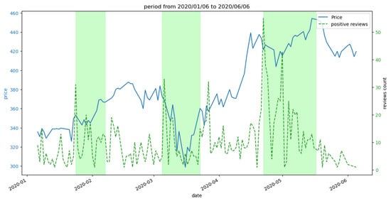 During the same time period in which the negative review plot reached its peak, the plots for positive reviews (Figure 6) and the total count of reviews also exhibited a significant peak, surpassing the count of negative reviews in the second green marked area. This observation suggests a potential correlation between the subsequent increase in price value and the aforementioned trends, as depicted in the figures. Similar observations may be made in the vicinity of the temporal interval ‘02-2020’, wherein the count of positive reviews and the reaction plots exhibit comparably lower peaks, succeeded by an increase in price magnitude in proximity to the first green demarcated region.
