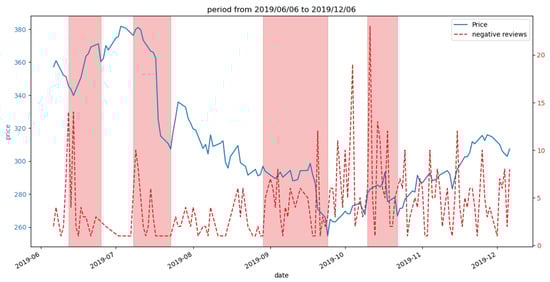 The negative review figure (Figure 4) shows four distinct regions that have been highlighted in red. During the observation of these periods, it was seen that the price plot often exhibited a decline in value following a sequence of peaks represented by negative review plots, with a time delay. Following a brief interval, the value experienced a subsequent increase, a phenomenon that can be attributed to the influence of favorable reviews.