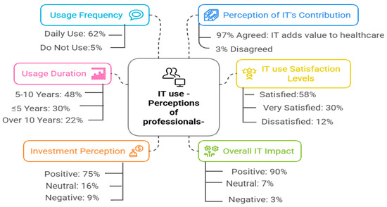 The following Figure 1 presents key indicators related to healthcare professionals’ interaction with technology, including usage duration, satisfaction levels, and perceived impact. These percentages are reported to illustrate perceptions of IT’s contribution, investment, and overall effectiveness in the Moroccan healthcare context.