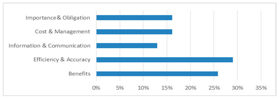 Key benefits of technology identified by healthcare professionals included improved efficiency and accuracy (29%), general benefits (26%), and enhanced information and communication (13%). Additionally, 16% highlighted cost management advantages, while another 16% emphasized the necessity and obligation of technology use in healthcare organizations. These findings underscore a strong consensus among professionals about the significant and beneficial role of technology in their organizations (see Figure 2).