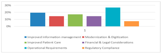 Healthcare professionals identified several motivations for investing in information technology. The primary motivation was operational requirements, cited by 27% of participants. Improved information management was the second most significant factor, mentioned by 20%, followed by the desire to enhance patient care (17%). Modernization and digitization motivated 15% of professionals, while financial and legal considerations were noted by 15%. Finally, regulatory compliance was a motivation for 7% of the respondents (see Figure 3).