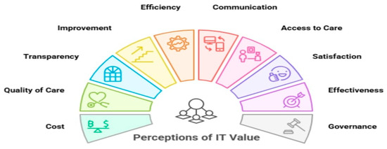 The integration of information technology (IT) into healthcare systems has become essential in modern healthcare practices, providing opportunities to enhance quality, efficiency, and accessibility [1]. In recent years, Morocco has recognized the transformative role of IT within its healthcare sector, especially as the country seeks to overcome systemic inefficiencies and improve healthcare outcomes [2,3]. However, even though information technology can play an important role, the value created by this technology is perceived differently among healthcare professionals, who often face various infrastructural, economic, and training barriers [4].