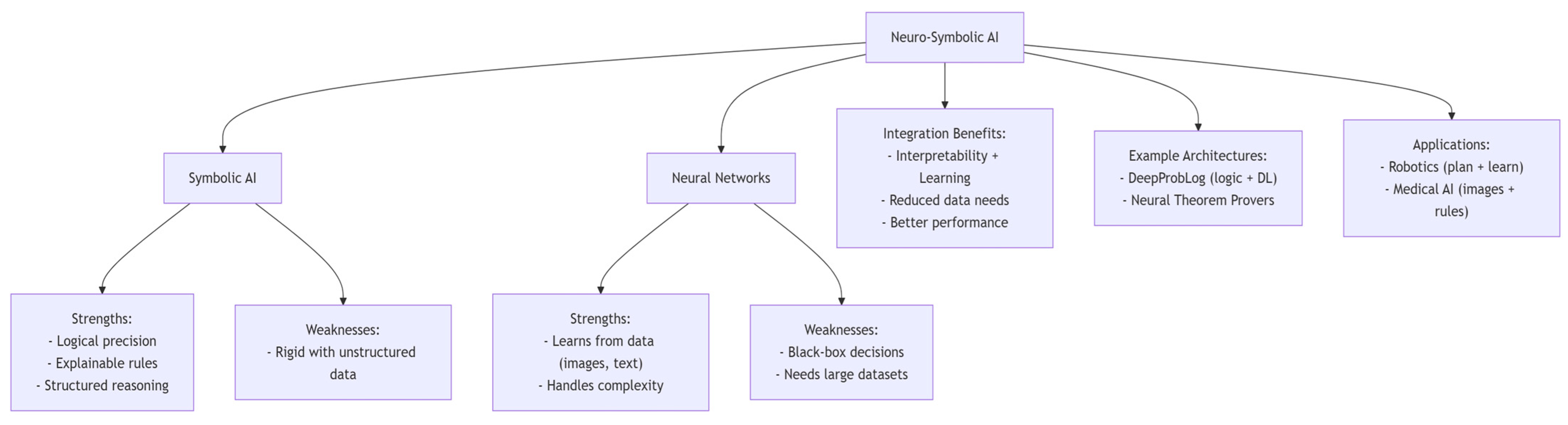 Advantages | Transparency, clear logical reasoning. | Flexibility, learning from complex data. | Combination of the strengths of both approaches. |