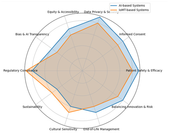 Figure 1 encapsulates the multifaceted ethical landscape surrounding the integration of AI and the IoMT in healthcare. These technologies promise transformative advancements, yet their deployment demands rigorous ethical scrutiny to ensure they align with societal values, patient rights, and global sustainability goals. Below is a comprehensive interpretation of the interconnected ethical domains and their implication. The radar chart visualizes ethical considerations for AI-based and IoMT-based systems in healthcare, comparing how each aligns with key ethical dimensions.