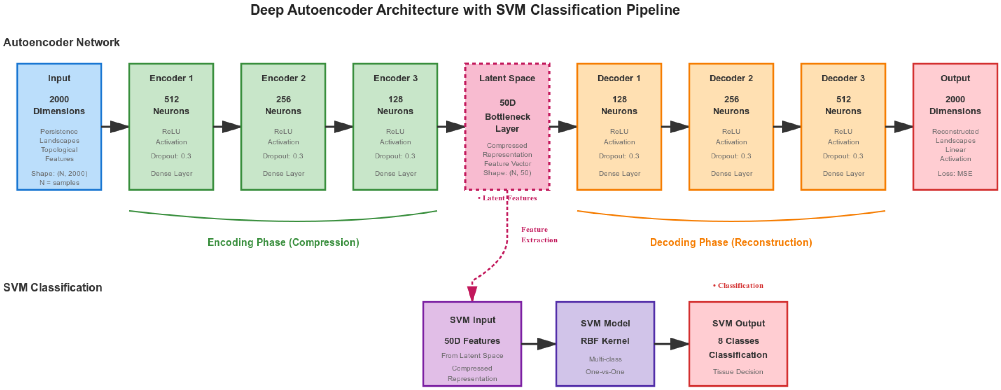 Figure 2 illustrates the complete autoencoder-SVM architecture used in our implementation. The pipeline processes topological features through the following four steps: