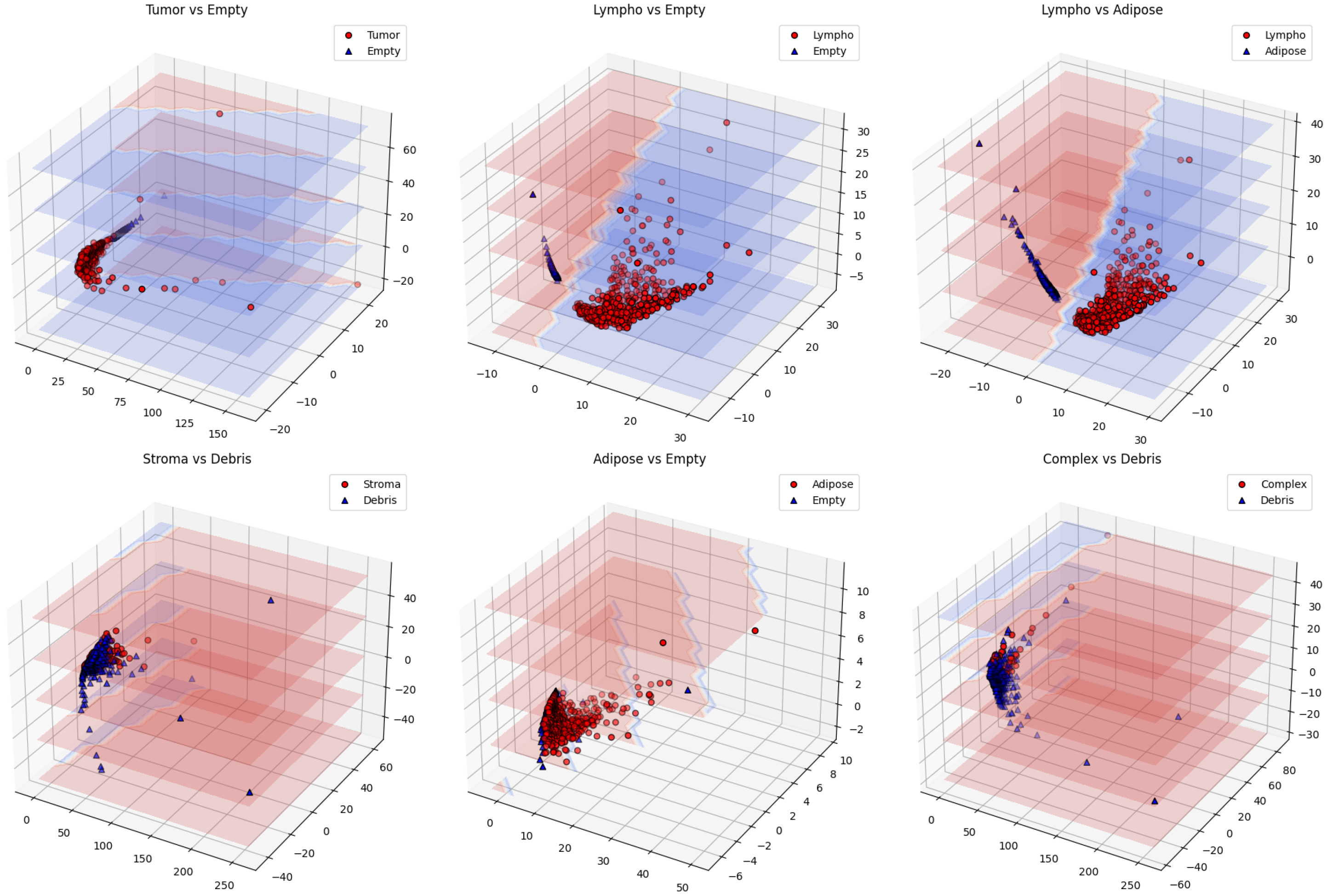 Pairwise separability was evaluated using three distinct methods: (1) Visualizing the feature space with 3D Principal Component Analysis (PCA), by compressing the 50-dimensional features into three dimensions to visually represent how well the classes are separated; (2) Calculating the margin width, which involves measuring the geometric space between the boundaries for making decisions and the support vectors to indicate how reliable the classification is; and (3) Analyzing the decision boundary, which includes assessing how complex the boundary is to pinpoint the tissue pairs that are linearly separable versus those that are topologically overlapping.