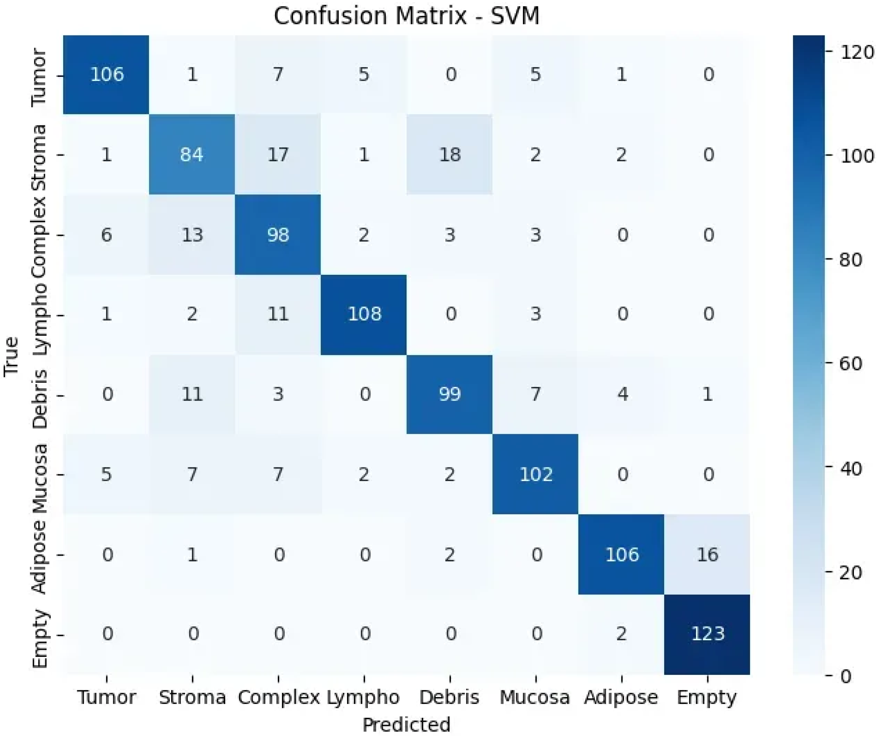 Figure 5) reveals strong diagonal performance with notable error patterns: stroma frequently misclassified as debris due to similar fibrous topological signatures, complex tissues showing distributed errors reflecting their mixed nature, and occasional adipose-empty confusion from similar cavity-like patterns. These errors provide insights into topological similarities between biologically related tissue types, validating the biological relevance of the extracted features.
