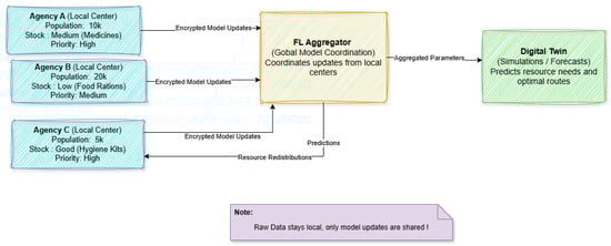 In this scenario, FL-DT-HSC operates as follows: Local agencies train models on regional datasets, such as stock inventories, weather forecasts, health trends, sharing encrypted updates with the FL Aggregator—this resource flow is illustrated in Figure 2. The Aggregator constructs a global model, feeding the DT to simulate logistics operations. The DT might propose reallocating hygiene kits from Region C to Region B, utilizing B as a transit hub to bypass flooded routes between A and C, and prioritizing medicine deliveries to A based on disease risk forecasts. As an example, if Region A’s model, using historical flood data to predict a 48 h cholera spike, suggests diverting medicine stocks through B, using real-time updates of road conditions from C to minimize delay, the DT can do so in the meantime. Region B’s higher population may generate a DT suggestion to pre-emptively prestock food rations, preventing shortages as demand increases. Region C’s excess of hygiene kits can be diverted to a refugee camp in a neighboring region beyond the first three, increasing the system’s applicability.