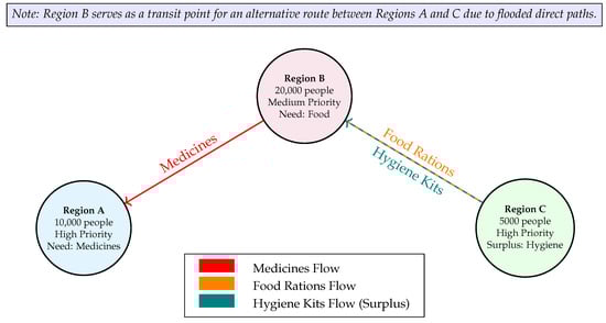 The 2022 Pakistan floods displaced over 33 million people, severed supply chains, and triggered urgent demands for food, medicine, and hygiene kits across vast regions []. We propose a hypothetical three region scenario to test FL-DT-HSC’s capabilities, as outlined in Table 1. Region A (10,000 people) faces a high-priority medicine shortage due to heightened risks of waterborne diseases like cholera; Region B (20,000 people) requires food rations to sustain a larger population; Region C (5000 people) holds surplus hygiene kits but needs coordination to address broader shortages effectively.