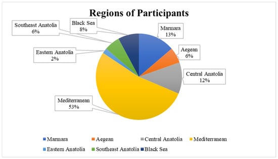 Participants represented various sectors, including urban planning (11.5%), environmental governance (21.15%), academic research (30.8%), private consultancy (11.5%), environmental NGO representative (5.8%), and other (19.23%). The geographical distribution of the 52 respondents who returned by sending e-mails to institutions and organizations interested in climate change and flood risk assessment in 7 regions of Turkey is shown in Figure 2.