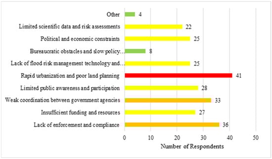 According to respondents’ responses, the most frequently cited barriers were rapid urbanization and poor land planning (41%), followed by a lack of enforcement and compliance (36%), indicating that institutional challenges and financial constraints are the most critical barriers to improving flood resilience. Qualitative responses reinforced these findings, with participants noting systemic governance failures, lack of public awareness, and the need to protect riverbeds and redesign urban drainage systems.