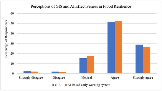 Survey results show that 75% of respondents were familiar with GIS and AI-based early warning systems, and over 79% believed these technologies could improve flood forecasting and emergency response. Additionally, 80.4% agreed that GIS could enhance national flood resilience (see Figure 4).