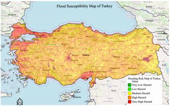 Oğuz et al. [20] identified five flood risk categories. Based on this method, the detected criteria were combined to classify regions as very low, low, medium, high, and very high-risk zones (see Figure 6).
