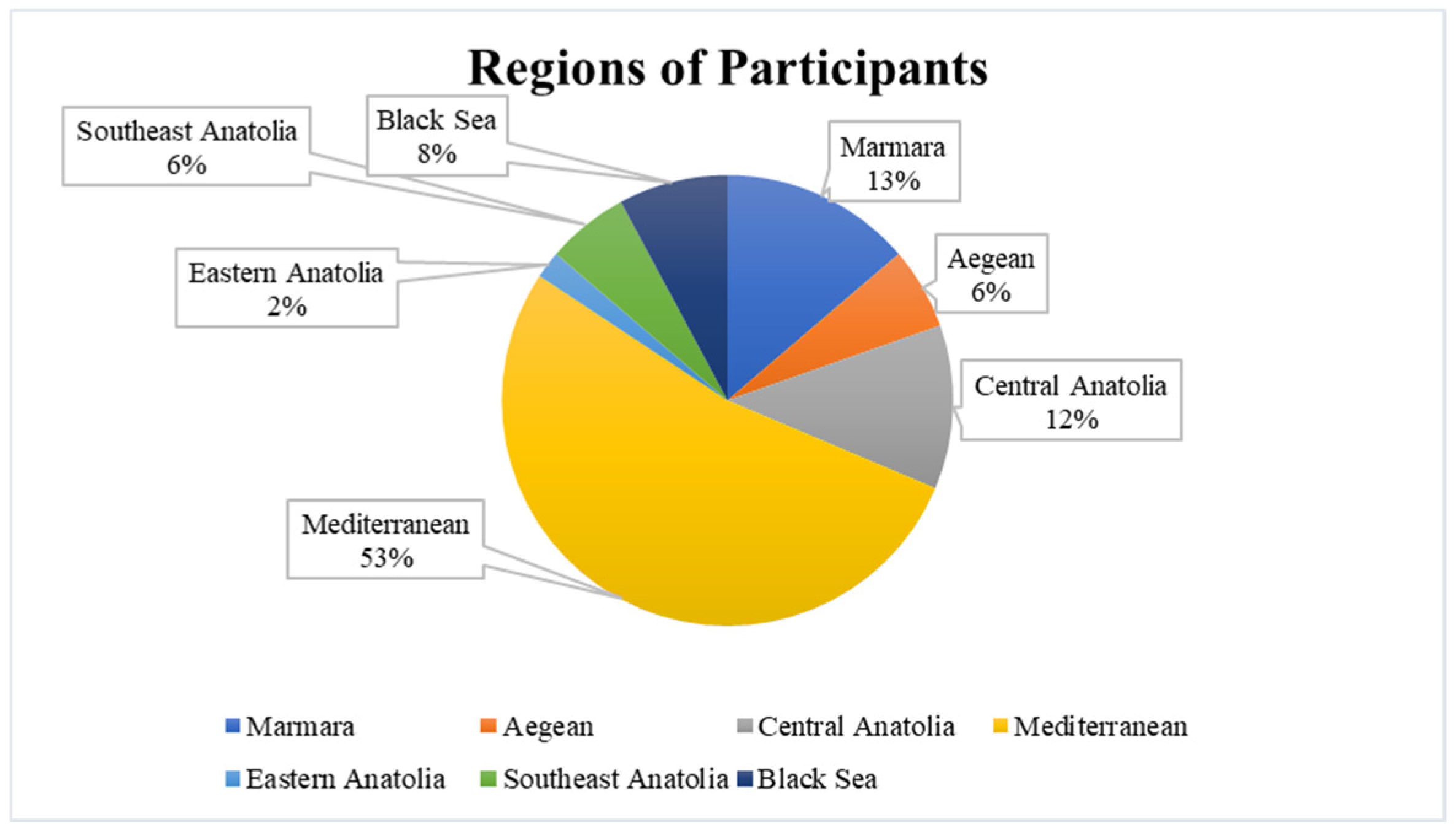 Participants represented various sectors, including urban planning (11.5%), environmental governance (21.15%), academic research (30.8%), private consultancy (11.5%), environmental NGO representative (5.8%), and other (19.23%). The geographical distribution of the 52 respondents who returned by sending e-mails to institutions and organizations interested in climate change and flood risk assessment in 7 regions of Turkey is shown in
