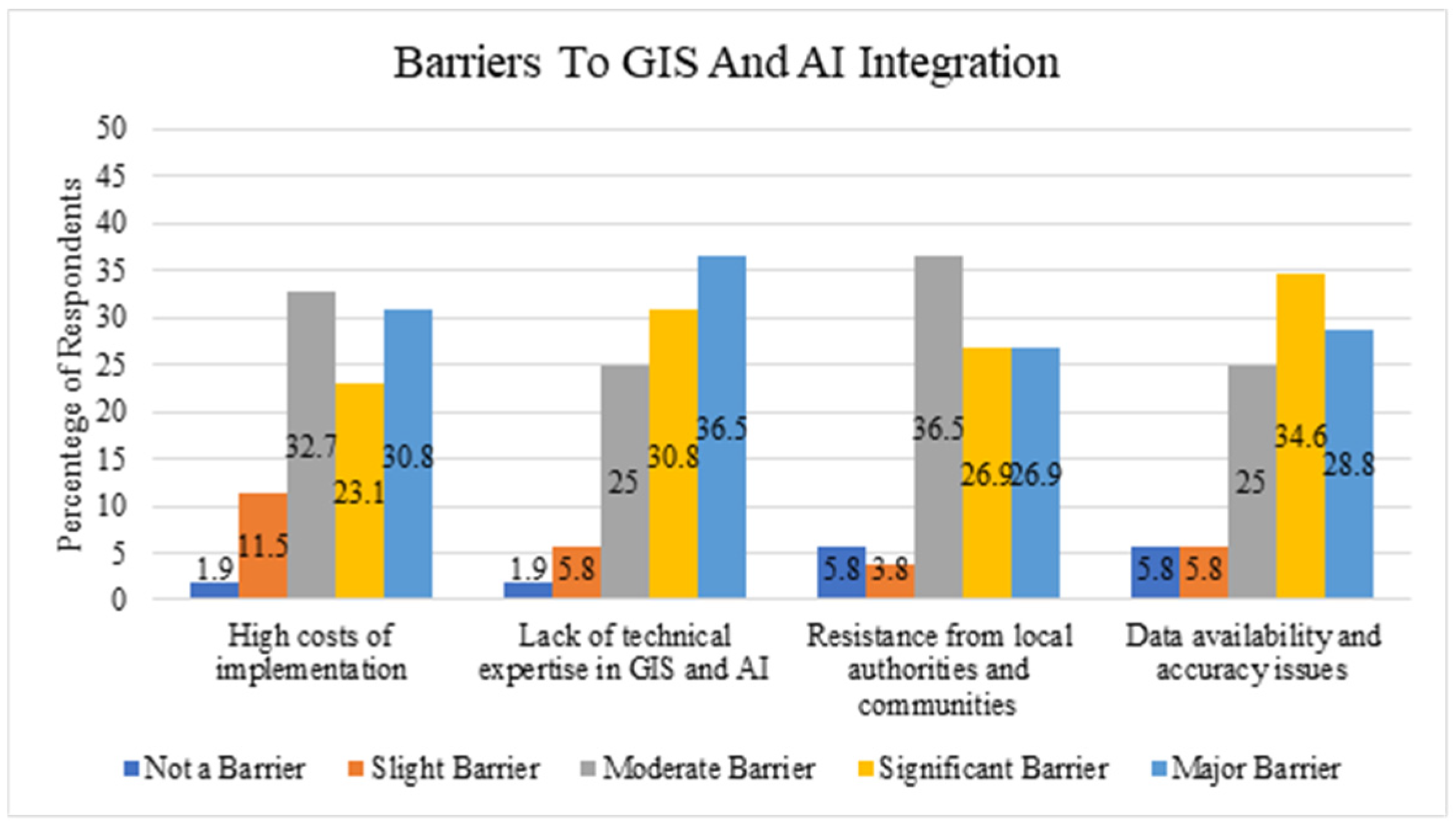 Key implementation barriers include limited technical expertise, data quality concerns, and high costs. Specifically, 36.5% cited a lack of skilled personnel as a major barrier, while 63% identified financial constraints as moderate to major challenges. Data reliability was also noted, with 34.6% pointing to issues in spatial and meteorological datasets (see