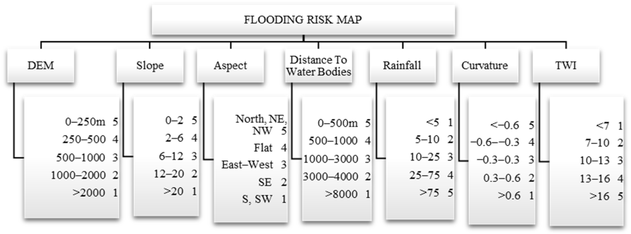 19], relative weights were assigned to each factor according to their influence on flood susceptibility: rainfall (22%), elevation (20%), slope and proximity to water bodies (15% each), TWI and curvature (10% each), and aspect (8%). High rainfall and low elevation increase runoff accumulation, while concave curvature and high TWI signal higher soil saturation. Proximity to water and gentle slopes further elevates risk, whereas aspect influence evaporation and water retention. This weighted overlay analysis produced composite flood risk maps to inform disaster preparedness and climate adaptation strategies.