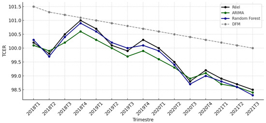 The ARIMA model, often used in the literature as a univariate benchmark [2,3], succeeds in reproducing historical trends, but fails to anticipate inflections associated with exogenous ruptures such as the COVID-19 crisis. The DFM, for its part, although underpinned by solid foundations in empirical macroeconomics [9], suffers in this context from an excessive reduction in information, which limits its ability to accurately reflect the cyclical tensions affecting the REER.