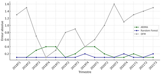 Figure 2 allows us to assess the temporal stability of model performance by observing their absolute errors quarter by quarter over the period 2018Q1 to 2021Q3. This analysis is particularly relevant in a context of regime breaks and exogenous shocks, where models are expected to maintain their accuracy without falling out of sync with observed dynamics.