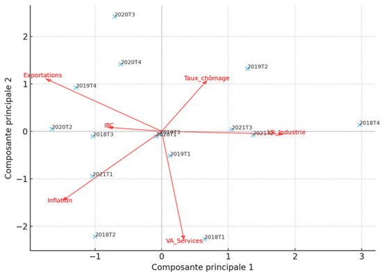 The distribution of projected quarters (2018Q1 to 2021Q3) in the factorial plane shows a structured temporal evolution. The years 2018 and 2019 appear relatively clustered, reflecting relative stability. By contrast, the quarters of 2020 and 2021, affected by the COVID-19 crisis, are far from the barycentre, illustrating a marked cyclical break in aggregate economic dynamics.