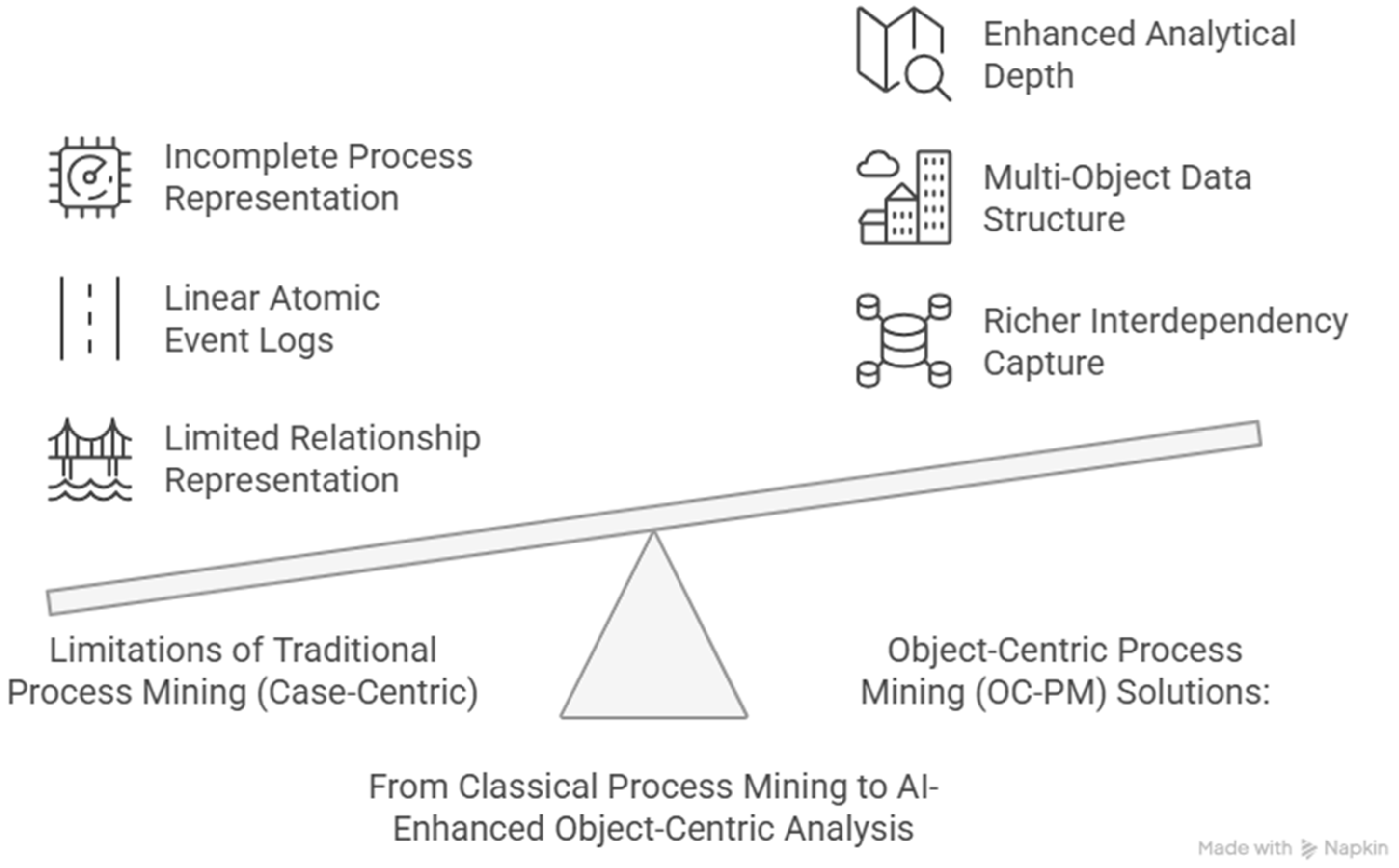 | [6] | Traditional process mining provides an incomplete representation of processes by focusing on a single case notion, which omits related object behaviors and fails to capture dependencies across multiple entities. |