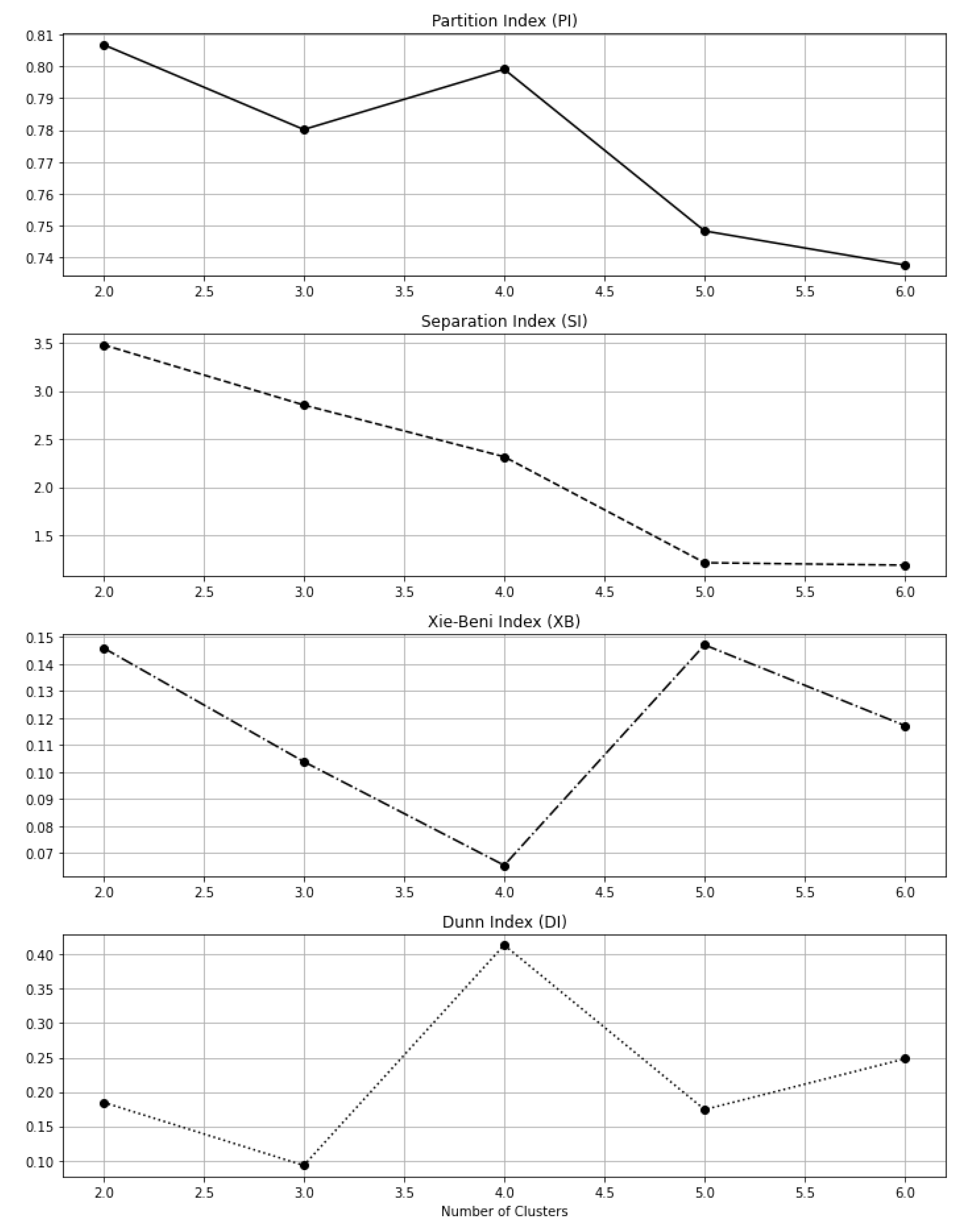 - Partition Index (PI): This index reflects the compactness of clusters by evaluating the sum of squared membership degrees. A higher PI value indicates stronger cluster cohesion and better membership concentration.