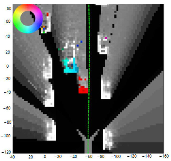 In Figure 4, the skeleton of a grid structure, termed a dynamic occupancy grid, is shown, whereby every color is indicative of the movement direction of the corresponding objects within the environment. The red cells encode objects (for example, the car in front of the ego vehicle), which are moving in a negative direction with respect to the abscissa axis; other colors, like violet and blue, are indicative of motion in different directions. The color coding is critical to learning the movement patterns around the vehicle, which has to be taken into consideration so that the system can maneuver within the ever-changing traffic situation.