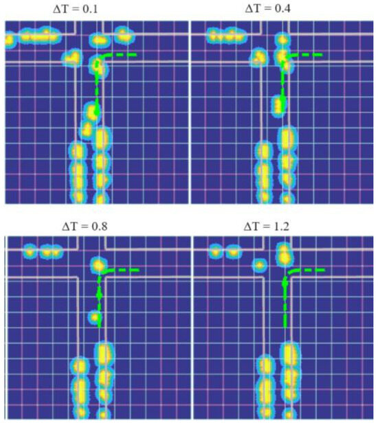 In Figure 4, the starting path of the ego vehicle crosses areas marked as occupied, which may, in turn, indicate a collision through the conventional static validation process. However, in an actively occupied space, the dynamic virtual occupancy adjusts via prediction of the movements of the neighboring objects. Red zones denote danger from collision, while blue denotes safety. With the passing of time, the car in front moves forward on the map, while stationary objects remain where they are. Figure 5 shows snapshots at 2.5 s, thus confirming the nature of collision-free parking of the ego vehicle in real-time motion.