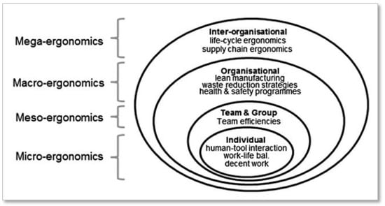 - Micro level: It considers individual interactions with tools, tasks, and work environments with the aim of minimizing the mental workload, reducing physical strain, and designing user-friendly interfaces and workstations.