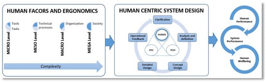 HFE operates at various levels—micro, meso, macro, and mega. As illustrated in Figure 3, each level addresses distinct aspects of human–system interactions [,]: