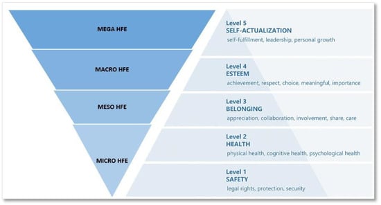 Micro HFE addresses safety (legal rights, protection, and security) and health (physical, cognitive, and psychological). Meso HFE focuses on belonging, fostering collaboration, appreciation, and involvement. Macro HFE aligns with esteem, emphasizing achievement, respect, and meaningful work. At the highest level, Mega HFE represents self-actualization, promoting leadership, personal growth, and fulfillment. Thus, HFE in Industry 5.0 supports a human-centric approach, ensuring workplaces meet fundamental and higher-level human needs while fostering performance and well-being.