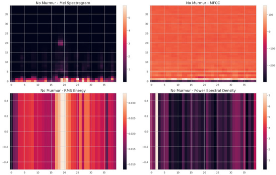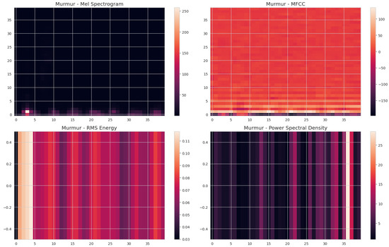 - Mel Spectrogram: The Mel spectrogram was computed by applying a Mel filter bank to the power spectrum of the short-time Fourier transform (STFT) of :where denotes the STFT of the signal and T is the number of time frames (approximately 40 for a 5-s segment).