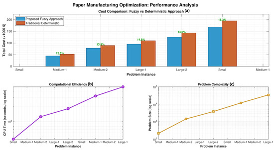 Paper manufacturing optimization performance analysis: (a) Cost comparison between proposed fuzzy approach and traditional deterministic method. (b) Computational efficiency showing CPU time requirements across problem instances. (c) Problem complexity analysis demonstrating scalability characteristics of the hybrid intelligent algorithm.