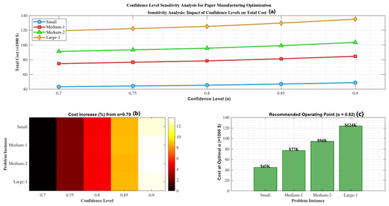 Confidence level sensitivity analysis for paper manufacturing optimization: (a) Impact of confidence levels on total costs across different problem instances, (b) Heatmap showing percentage cost increase from baseline ( = 0.70), (c) Recommended operating point costs at optimal confidence level ( = 0.82).
