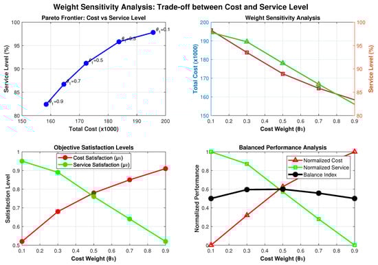 As shown in Table 4, there is a clear trade-off between cost and service level. When the cost weight () decreases from 0.9 to 0.1, the service level improves from 82.5% to 97.8%, but the total cost increases by approximately 23.2%. This demonstrates the fundamental trade-off relationship captured by the TH method.