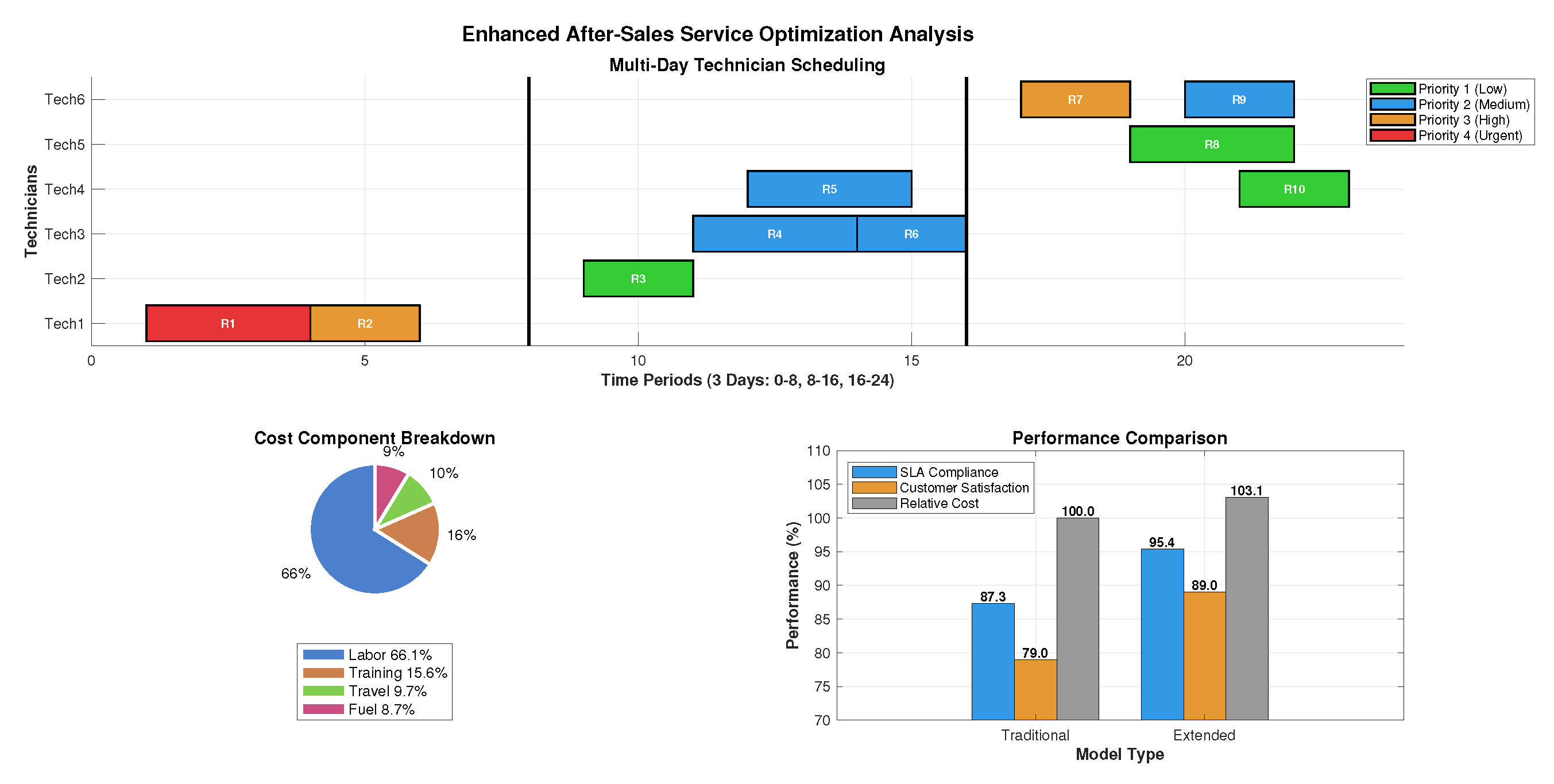 This model demonstrates significant improvements over traditional approaches, despite the moderate SLA compliance rate of 50.0%. The integration of inventory management achieved a 15% cost reduction through optimized spare parts allocation. Team coordination increased customer satisfaction by 13.9% while adding only 7.5% to labor costs. Multi-day planning enabled 23% better resource utilization compared to daily optimization.