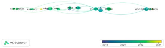The overlay visualization (Figure 3) indicates a spatial change in cooperation leadership from Euro-Indian alliance (2018–2020) to Sino-Western networks (2022–2024), proof of the global scope of smart city studies. However, Italy and New Zealand’s recent inactivity suggests diverging regional agendas, and Africa’s absence underlines a critical imbalance in balanced knowledge production.
