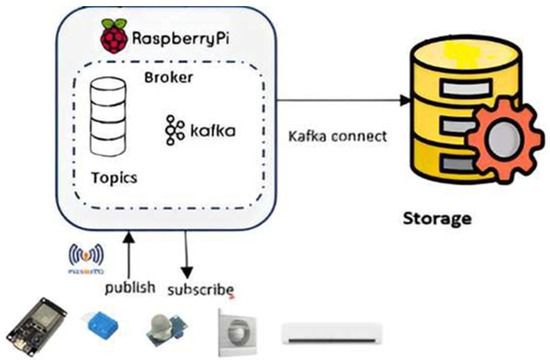 - Event collection: events from sensors or smart devices are sent to Kafka topics.