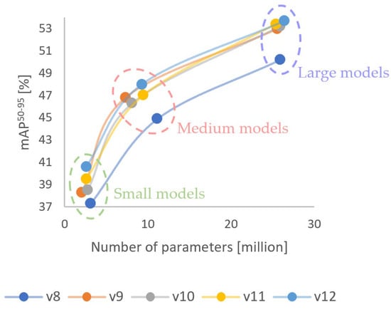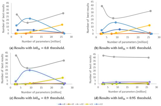 The trends shown in Figure 2 highlight clear differences in model performance across the evaluated IoU thresholds and model sizes. At the lower IoU thresholds (0.8 and 0.85), YOLOv12 and YOLOv10 models achieved the highest number of best results, particularly within the medium and large parameter ranges, reflecting their ability to handle more challenging detection scenarios with higher flexibility in bounding box accuracy. However, as the IoU threshold increased to 0.9 and 0.95, YOLOv10 consistently dominated across all model sizes, achieving the highest number of best results independently of the number of parameters. This indicates that YOLOv10 exhibits superior robustness and localization precision under stricter detection conditions, especially when high IoU is required. Furthermore, the results confirm that the latest versions (YOLOv11 and YOLOv12) showed better performance trends at lower IoU thresholds, suggesting improved detection capabilities under looser matching conditions, while YOLOv10 demonstrated the most stable and dominant performance at higher thresholds, making it a favorable choice for applications requiring strict object localization.