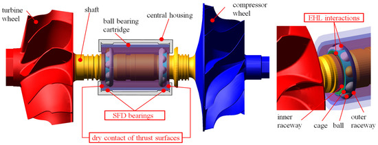 The tribological performance of the bearing system, including the ball bearing assembly in the cartridge with the SFD, is highly sensitive to dynamic effects. The current state of knowledge reveals significant shortcomings, particularly in the formulation of general rotor dynamics models that incorporate EHL contacts. Describing the effects of rotor dynamics on bearing loads requires advanced multibody modelling with much more detailed models of individual interactions. Multibody dynamics are relatively well researched and some of the methods will be used in this case as well. Examples of such approaches can be found in Novotný et al. [6,7,8].