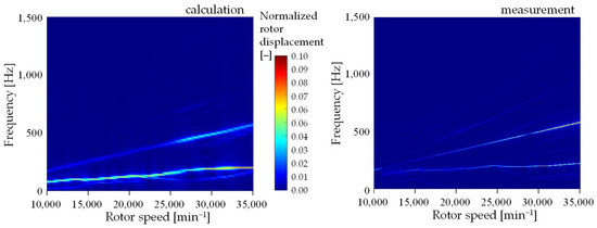 Verification was carried out on a turbocharger on a test bench. Verification of the computational model of the rotor bearing system was carried out by measuring the movement of the compressor nose during smooth rotor start-up. Figure 2 compares the calculated and measured deflections on the compressor nose in the axis perpendicular to the ground. For comparison purposes, the deflection values were normalized.