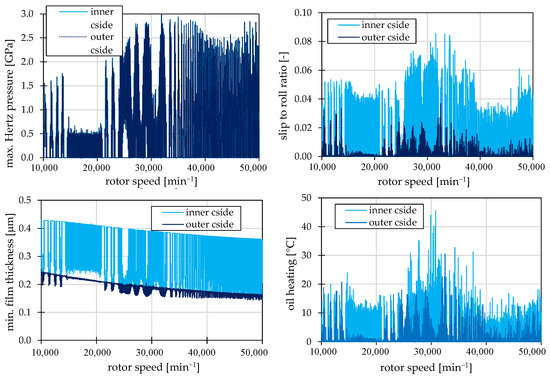 The results obtained by simulation include maximum Hertzian pressures (top left), slip to roll ratios (top right), central film thicknesses (bottom left), and oil heating in the contact zone (bottom right). Only the results of the ball raceway contact of the ball bearing on the compressor side are presented.