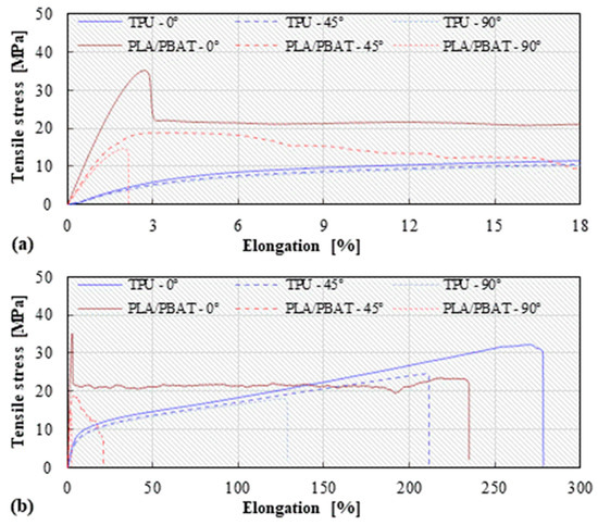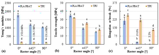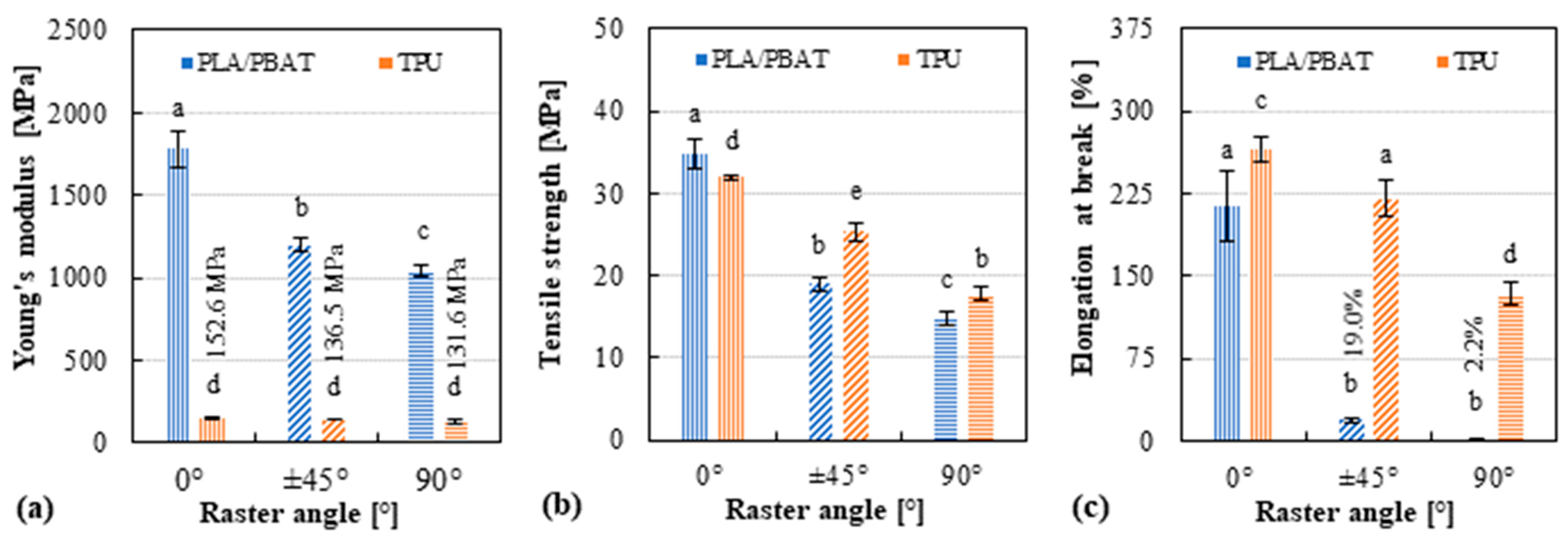 Figure 1a, the Young’s modulus of both TPU and PLA/PBAT decreased with increasing infill raster angle. The high modulus observed for samples 3D-printed with a 0° raster orientation can be ascribed to the alignment of deposited beads with the direction of the tensile load, allowing them to directly carry the load and thereby maximize the stiffness. Meanwhile, by increasing the raster angle (to ±45° or 90°), more load is transferred through the inherently weaker inter-bead bonds. Note that PLA/PBAT blends have an order of magnitude higher modulus (average of 1342 MPa) compared to TPU (average of 140 MPa). This considerable difference in stiffness indicates that the two materials are expected to behave quite differently under small deformations, with TPU being much softer. The higher modulus of the PLA/PBAT blends occurs due to the presence of PLA, which is considerably more rigid than either TPU or PBAT. Without PLA, however, PBAT alone would be difficult to process by MEX 3D printing, as it was pointed out in the Introduction section. It is also worth mentioning that, according to the statistical analysis, PLA/PBAT suffered a substantial reduction in Young’s modulus (from 1783 MPa to 1046 MPa) with increasing raster angle, while TPU was less sensitive to raster orientation, dropping only from 153 MPa to 132 MPa.