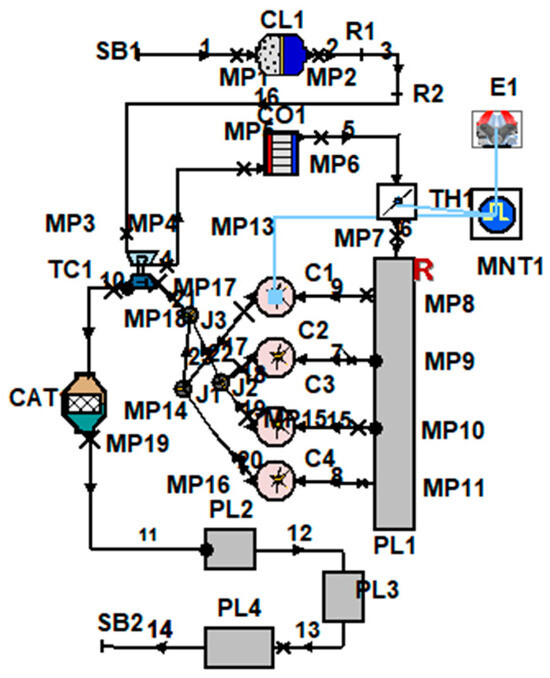 For the one-dimensional (1-D) simulation, the AVL BOOST 2023 R1 software was utilized, which enables the thermodynamic simulation of internal combustion engines. The constructed model is depicted in Figure 1. The intake and exhaust systems are represented by pipe segments (e.g., 1, 2, 3, etc.) connected to the cylinders (C1–C4). These segments simulate the flow paths from the air filter (CL1) to the end of the exhaust system.