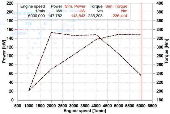 The results of the 1-D simulations were compared with the data obtained from engine test bench measurements. The validation was based on the following key parameters: engine power, torque, brake mean effective pressure (BMEP), peak firing pressure, air–fuel equivalence ratio and fuel consumption. The power–torque curve is shown in Figure 2, where the measured data are represented in black and the simulated data in red. In all subsequent figures, measured data are represented in black, while simulated data are shown in red. For statistical evaluation, the measured values were used as reference, and the relative deviations of the simulated results were calculated accordingly.