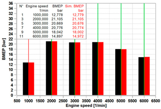 The values of the BMEP can be seen in Figure 3. The average absolute deviation was calculated to be 0.130%, indicating a high level of convergence between the simulation results and the experimental measurements.