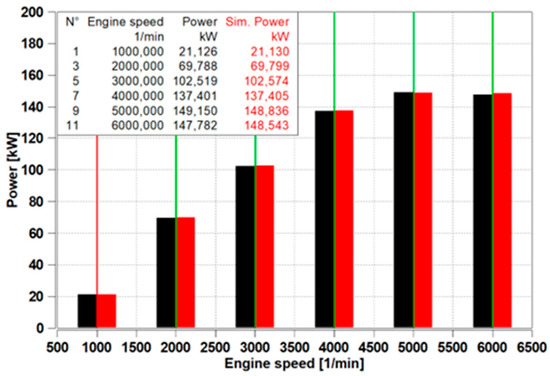 The measured and simulated engine power values are presented in Figure 4. The maximum deviation between the measured and simulated data is 0.515%, while the minimum deviation is 0.003%. The average deviation across all operating points is 0.136%, indicating a high level of agreement between the simulation results and experimental measurements.