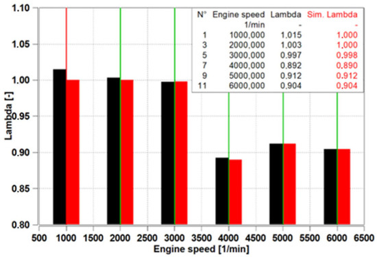 The air–fuel equivalence ratio of the simulated and measured engine at the operating points.